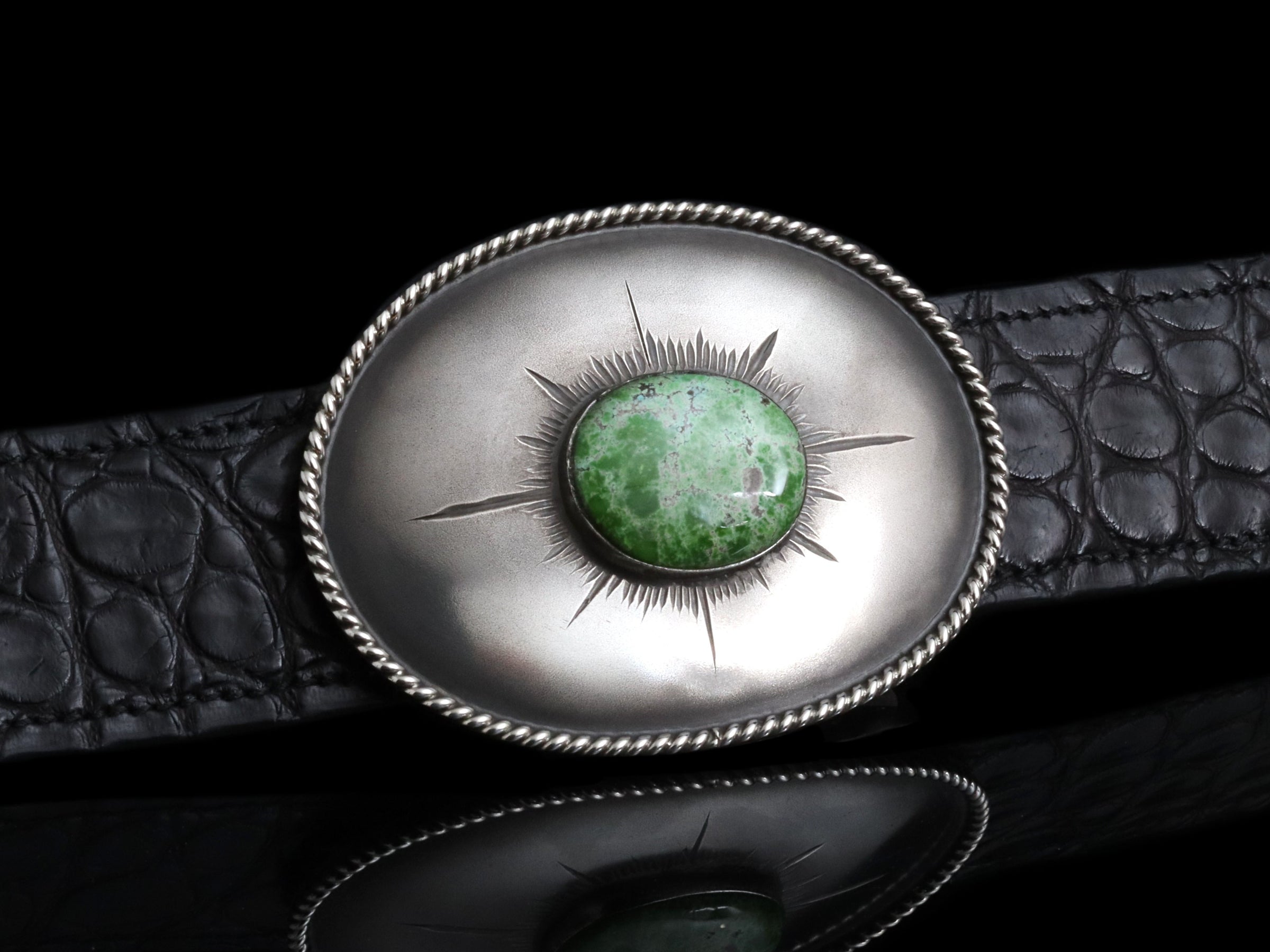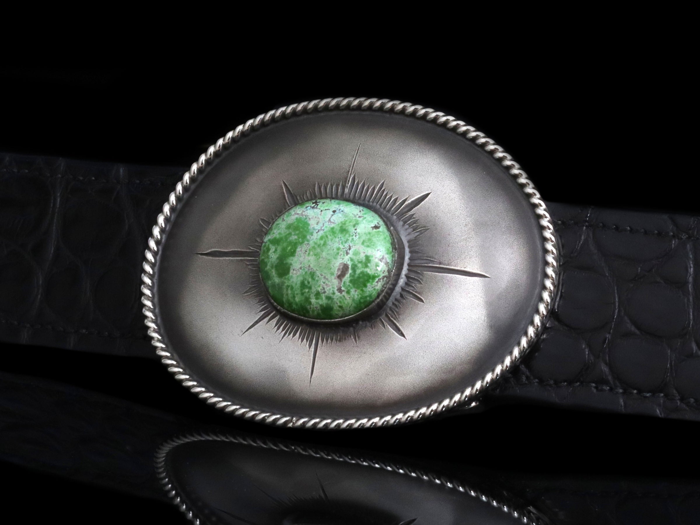 The AQR50 Carico & Rope by Comstock Heritage is a Sterling silver AQ50-shaped dress buckle with a rugged, timeworn character. Its centerpiece is a striking piece of green Carico Lake Turquoise, securely set in a Sterling silver bezel that enhances its natural beauty. A hand-wrought Sterling silver rope border surrounds the design, adding a classic Western touch to this distinctive buckle.