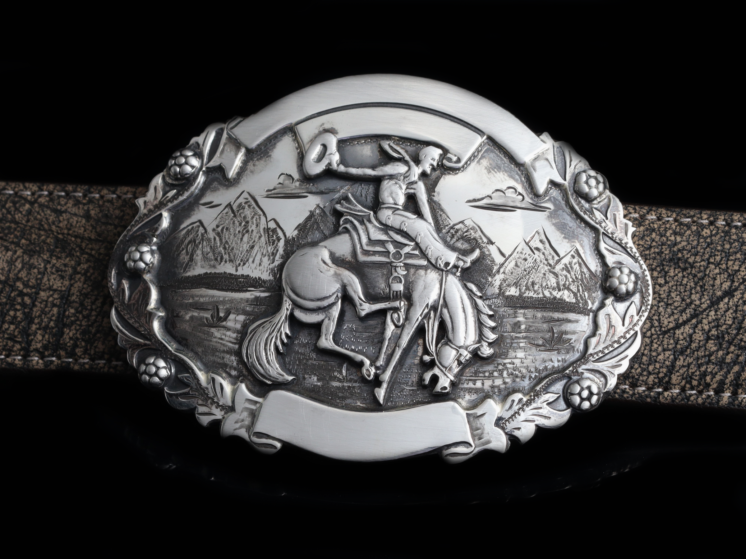 The BB10 Bronc by Comstock Heritage is a bold, trophy-style Sterling silver buckle designed with intricate detail. A hand-cut frame enhances the Sterling base, drawing the eye to the die-cut bronc and rider figure at the center. Below, a meticulously hand-engraved mountain scene adds depth and character, bringing a sense of movement and landscape to this Western-inspired piece.