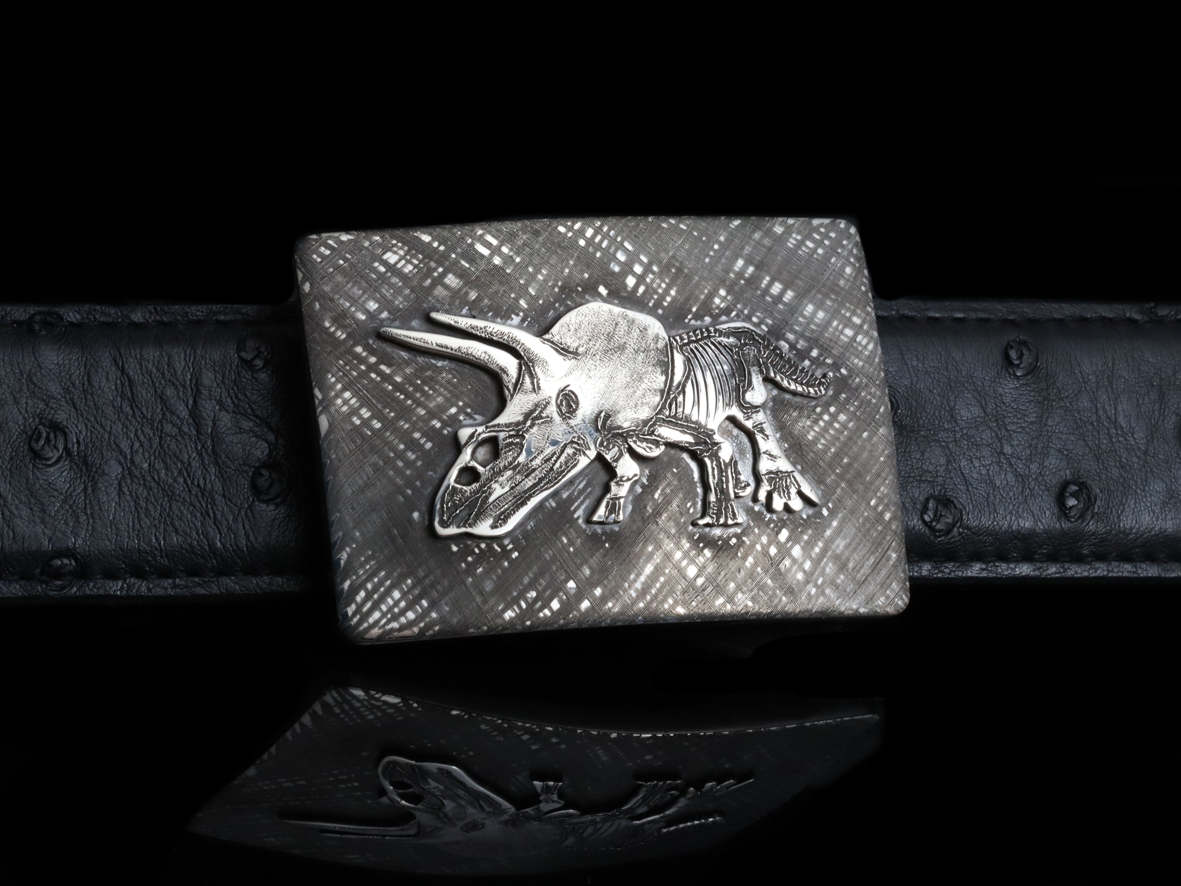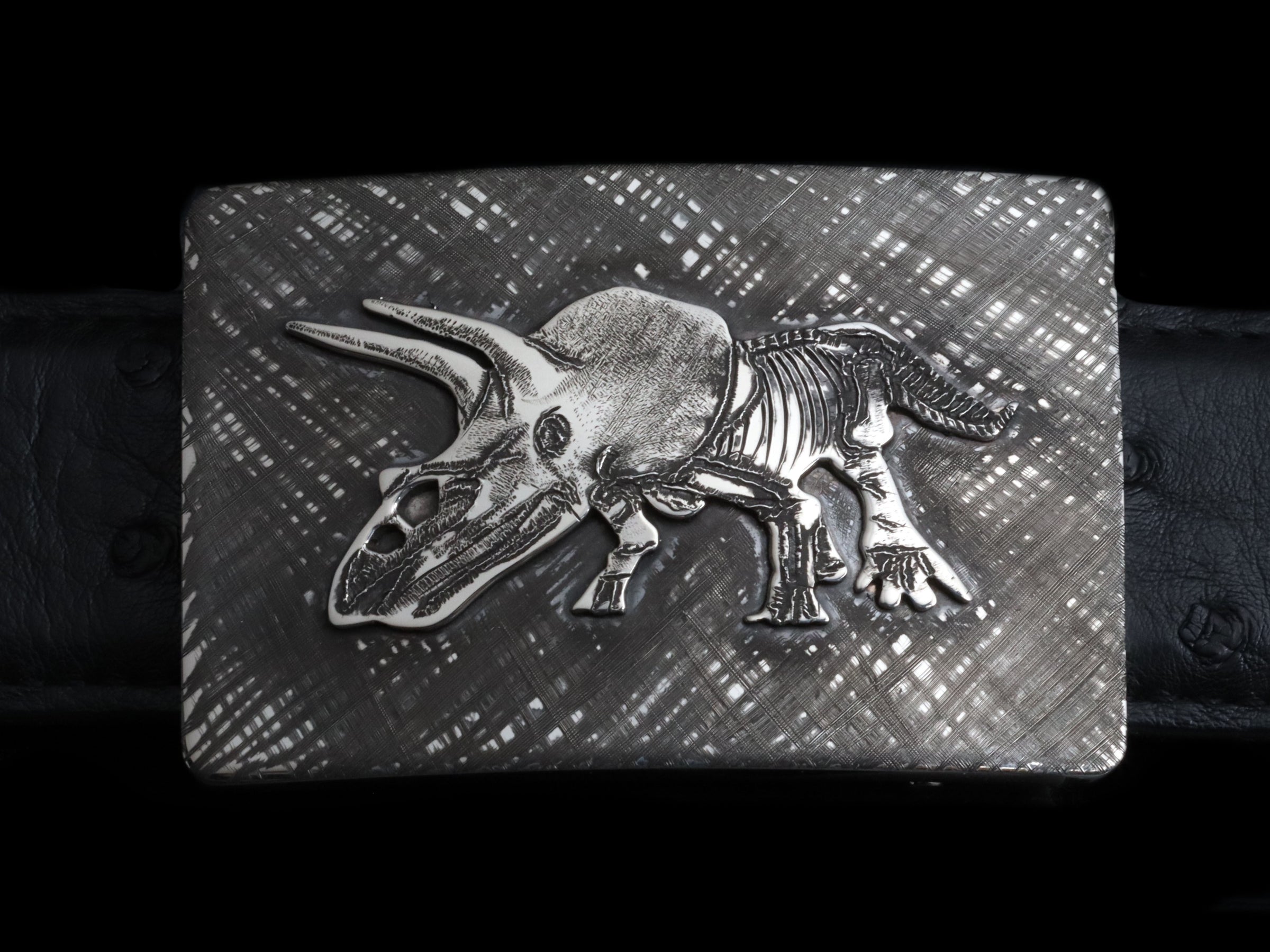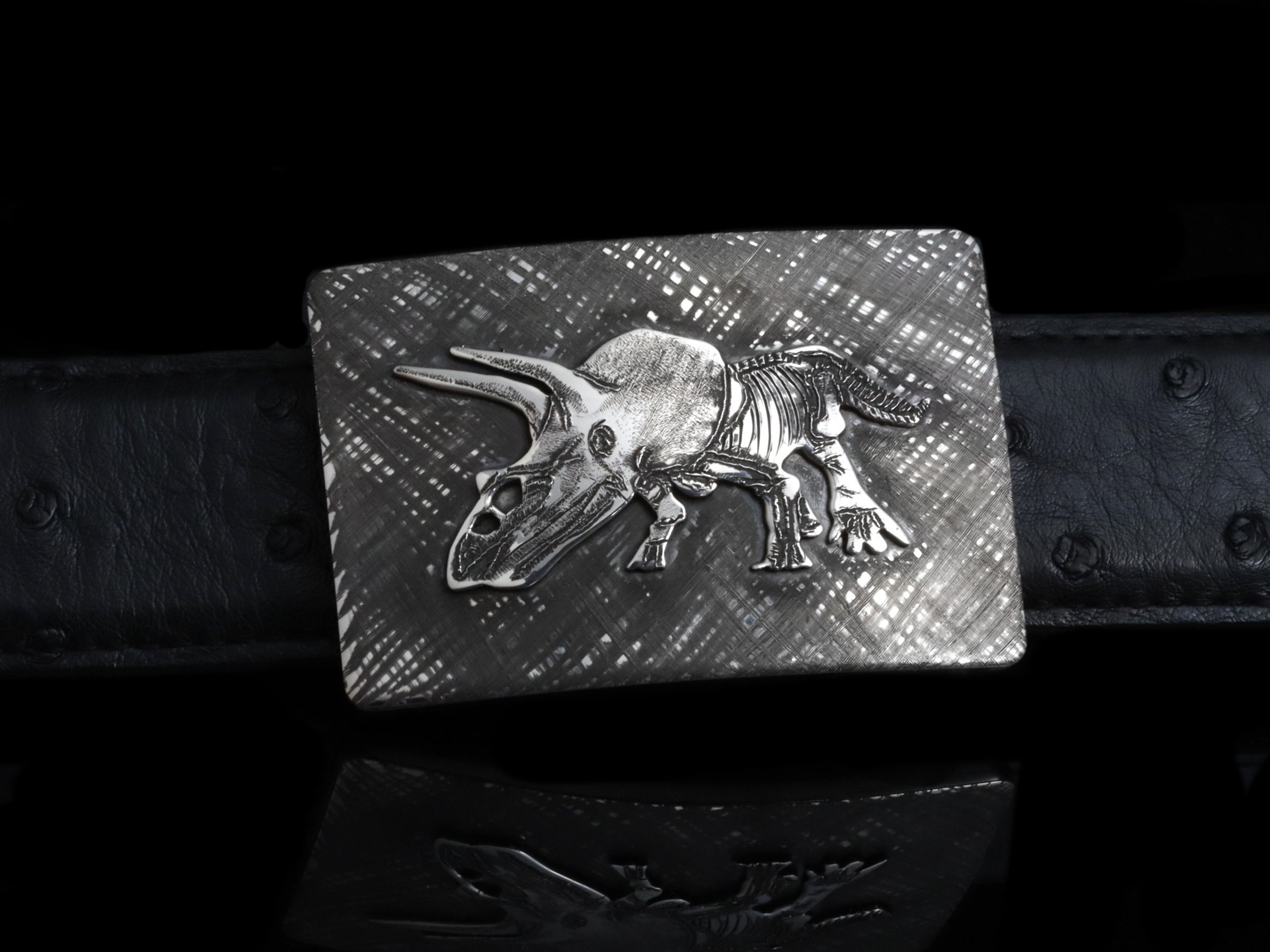 Created for a dear friend, the Mason Florentine Triceratops by Comstock Heritage is a Sterling silver Mason-shaped buckle with gently rounded corners, combining structured detail with incredible detail. At the center is a hand cut, Sterling silver triceratops based off the "Big John" fossil discovered in South Dakota's Hell Creek geological formation in 2014. Surrounding the dinosaur, Florentine hand engraving adds intricacy and visual interest, while an antiqued dark finish gives the buckle a classic, weathered appearance.