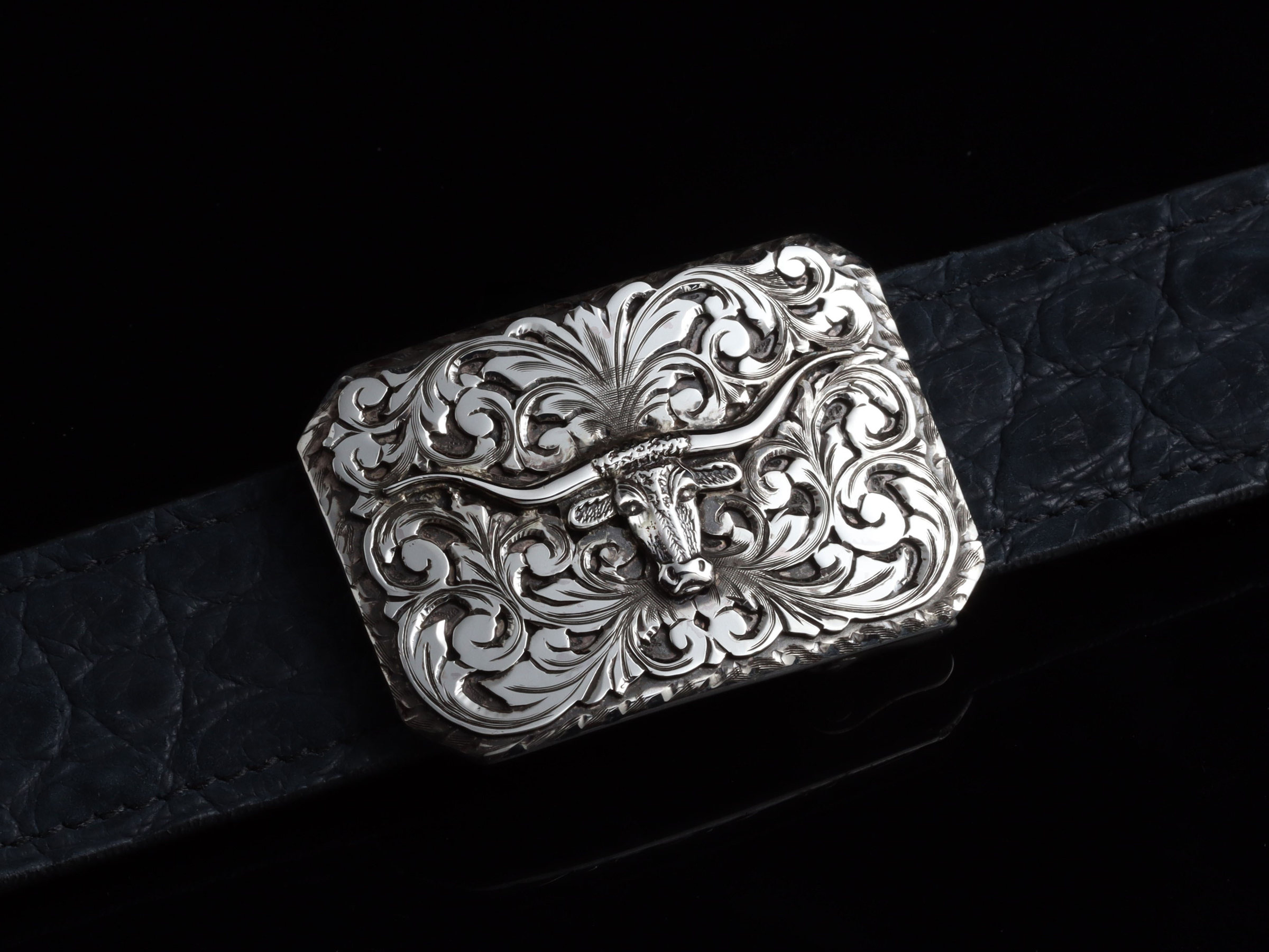 The Executive Longhorn, Two Colors by Comstock Heritage is a 1 ¼" Sterling silver "Charlie" style clipped corner buckle featuring hand cut Sterling silver scroll overlays under a hand cast longhorn in the center. We have two options, so please let us know what color longhorn you would like from the menu below.