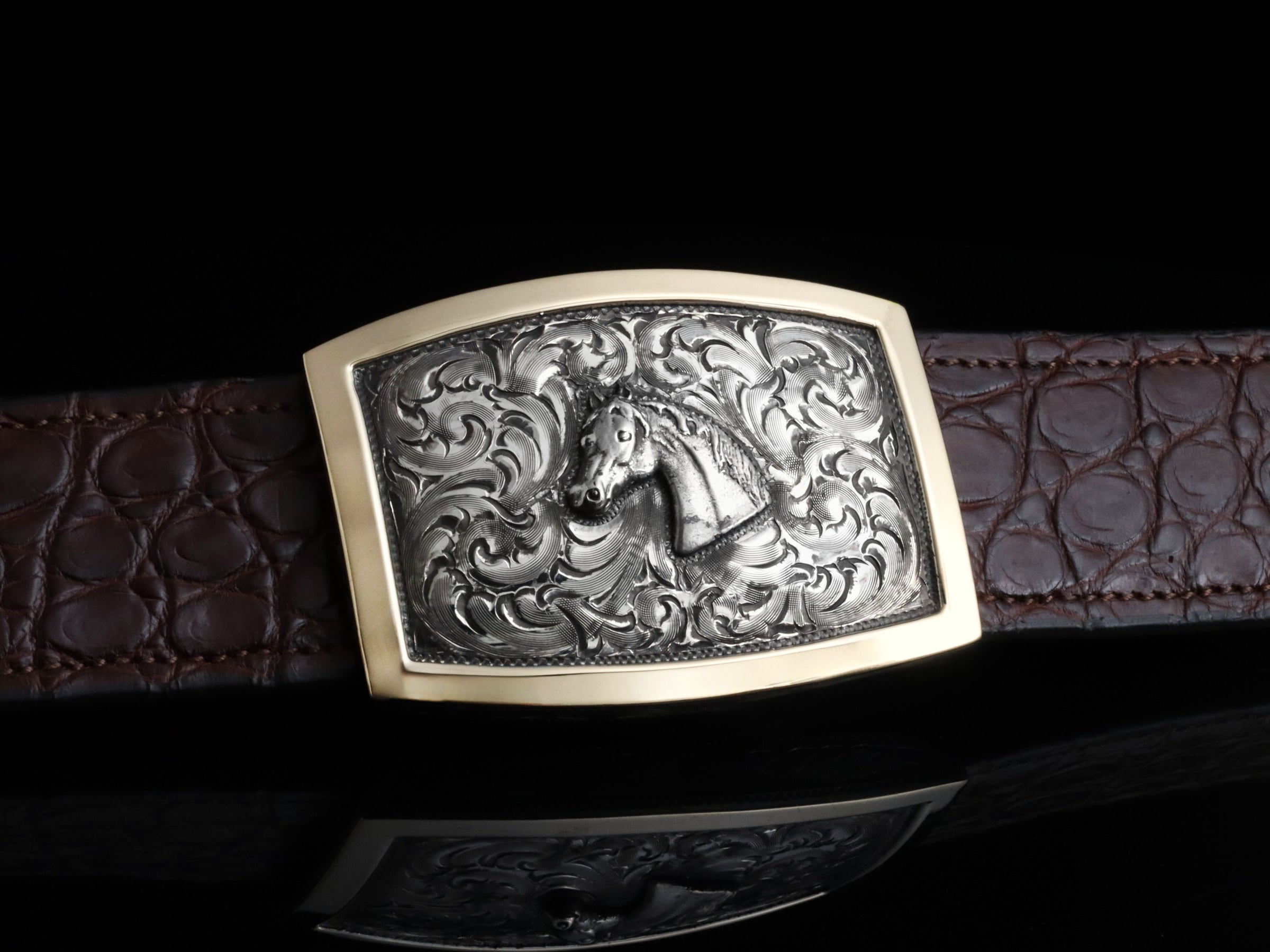 The Preston Davis Horse Head by Comstock Heritage is a scroll-engraved Sterling silver dress buckle with gently curved rectangular sides and a bold 14k yellow gold flat border. The combination of detailed silverwork and a smooth gold frame gives this piece a elevated presence that feels both classic and contemporary. Add in the addition of the Sterling silver horse head figure and you have the perfect gift for your equestrian.