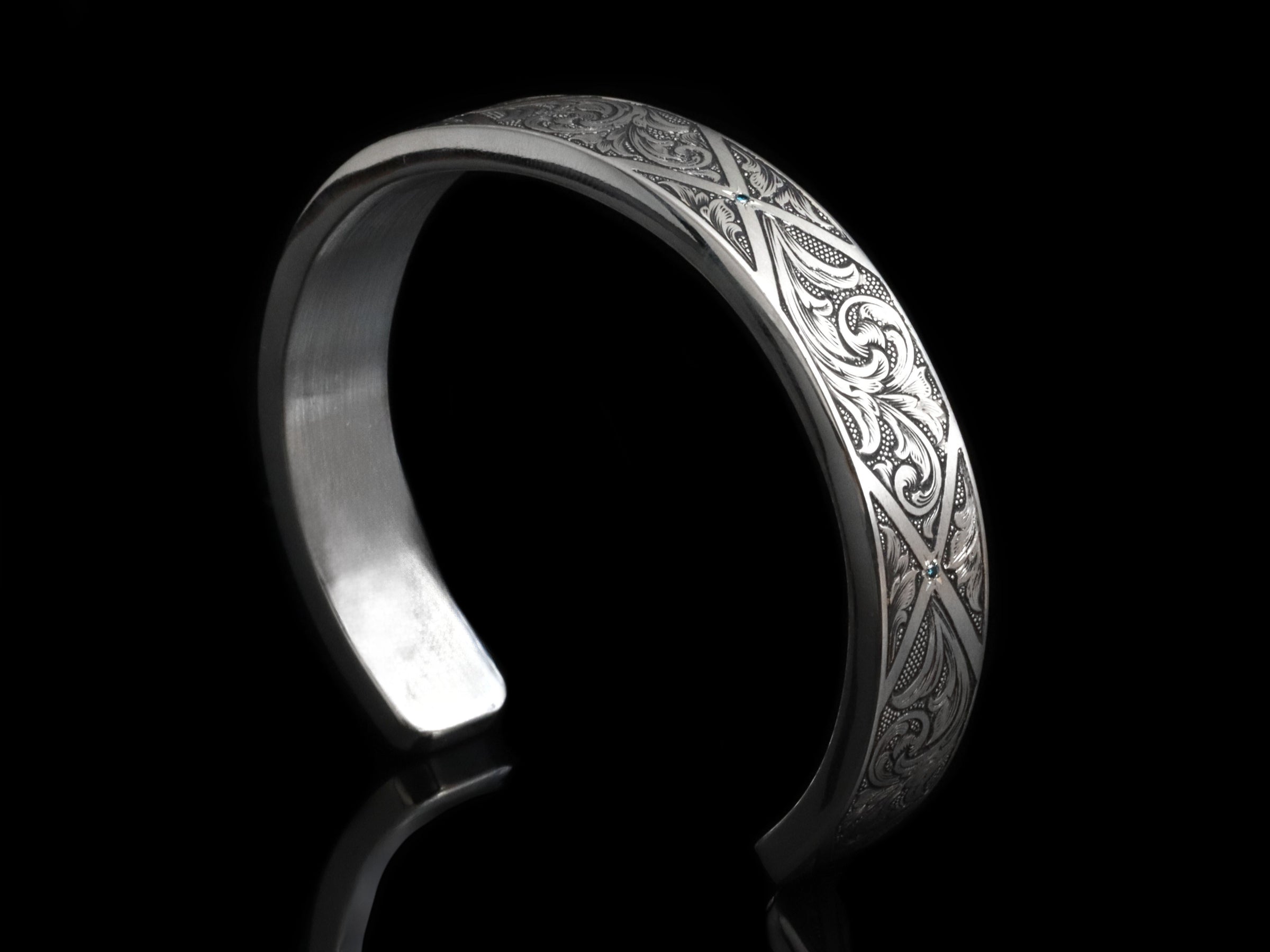 The Sammut Cuff by Comstock Heritage is part of an exciting new line in collaboration with  Sammut Designs. This Sterling silver ⅝” bracelet features a beautifully flowing engraved pattern, executed with precision. Blue diamonds sit in the apex of each cross section for a little glint as you show off your wrist.