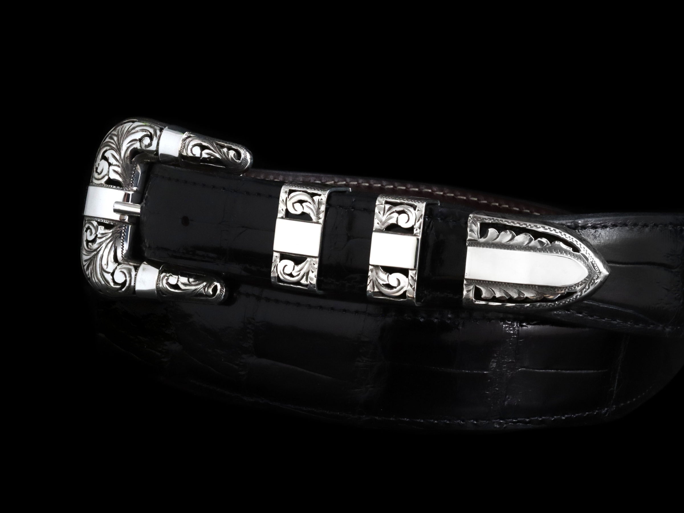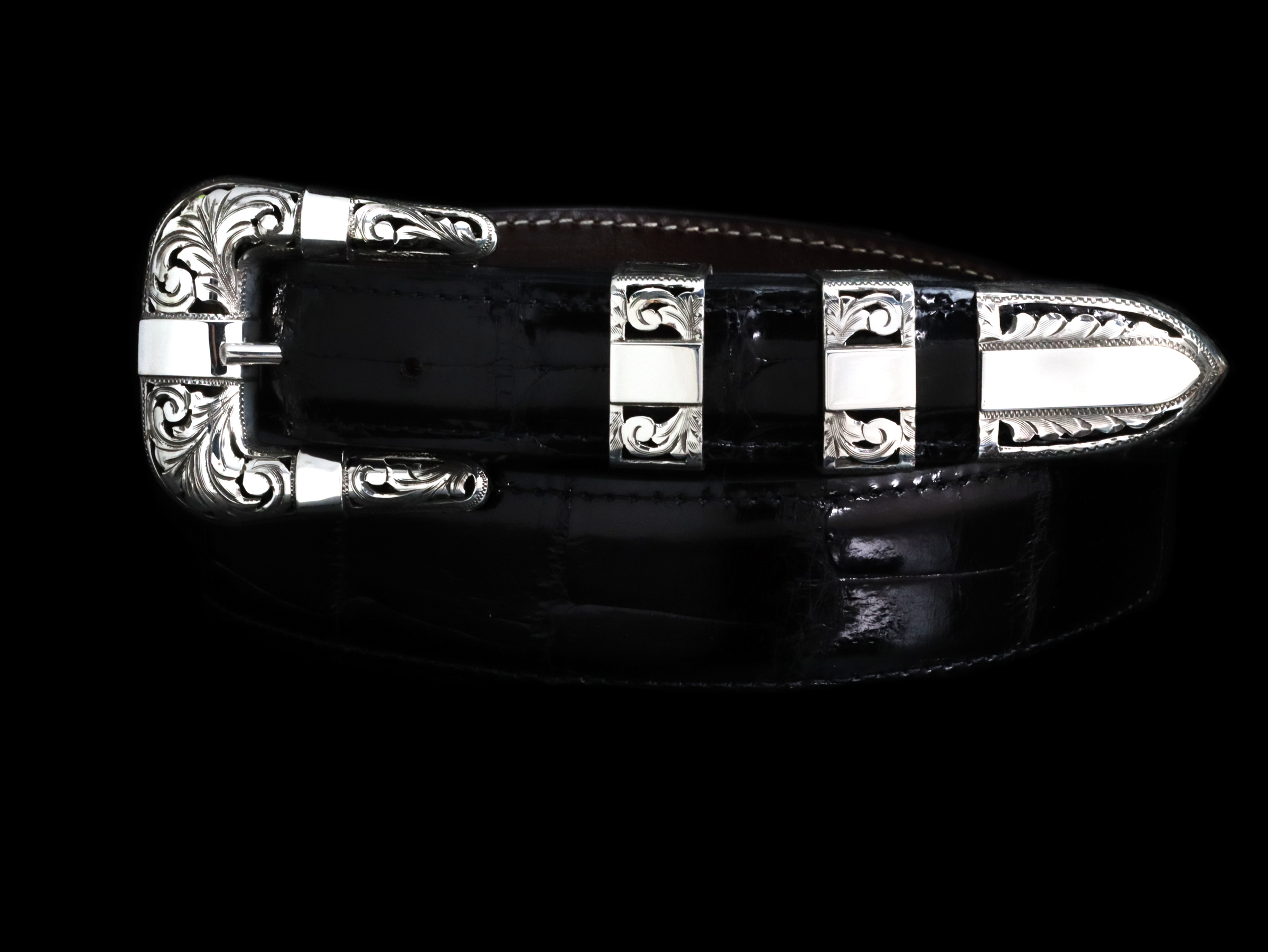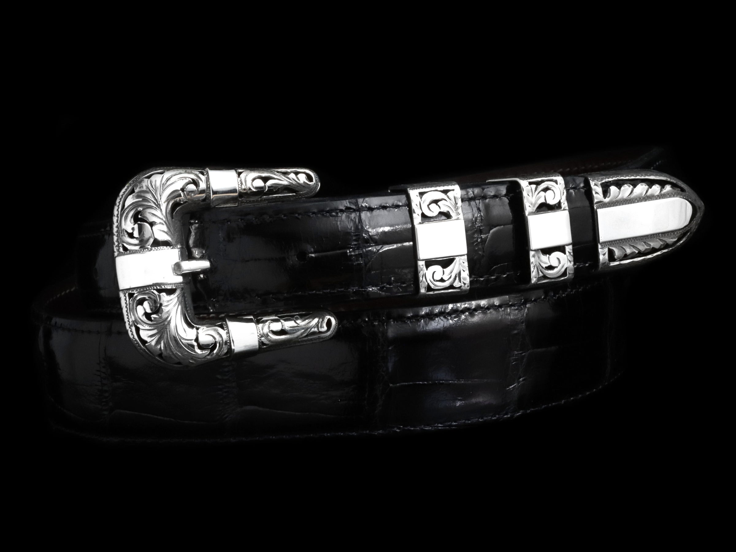 The Jack Set by Comstock Heritage is a 1" classic-shaped, Sterling silver four-piece buckle set with a classic look. Each piece of this set has been hand sawn all the way through, leaving delicate filigreed sides to solid Sterling bands in the center.