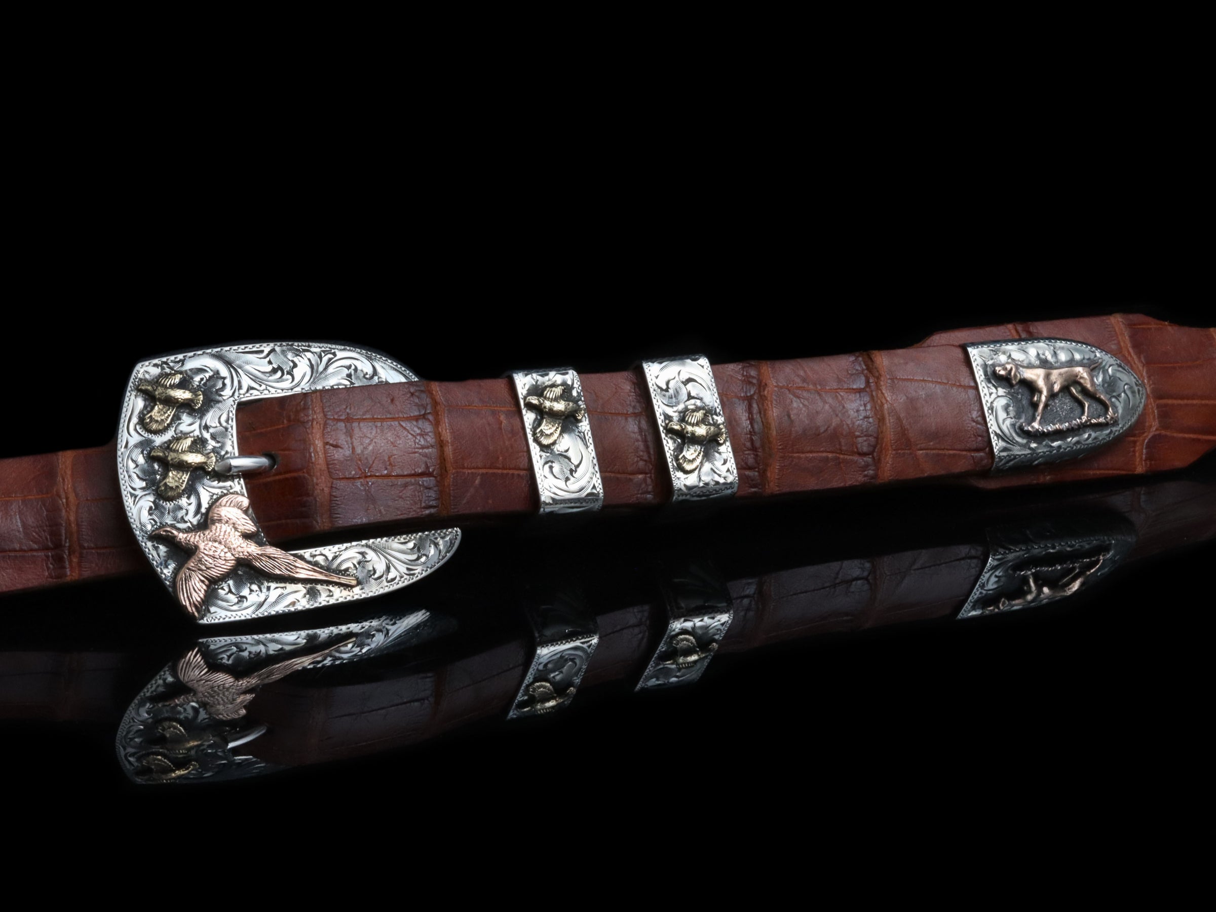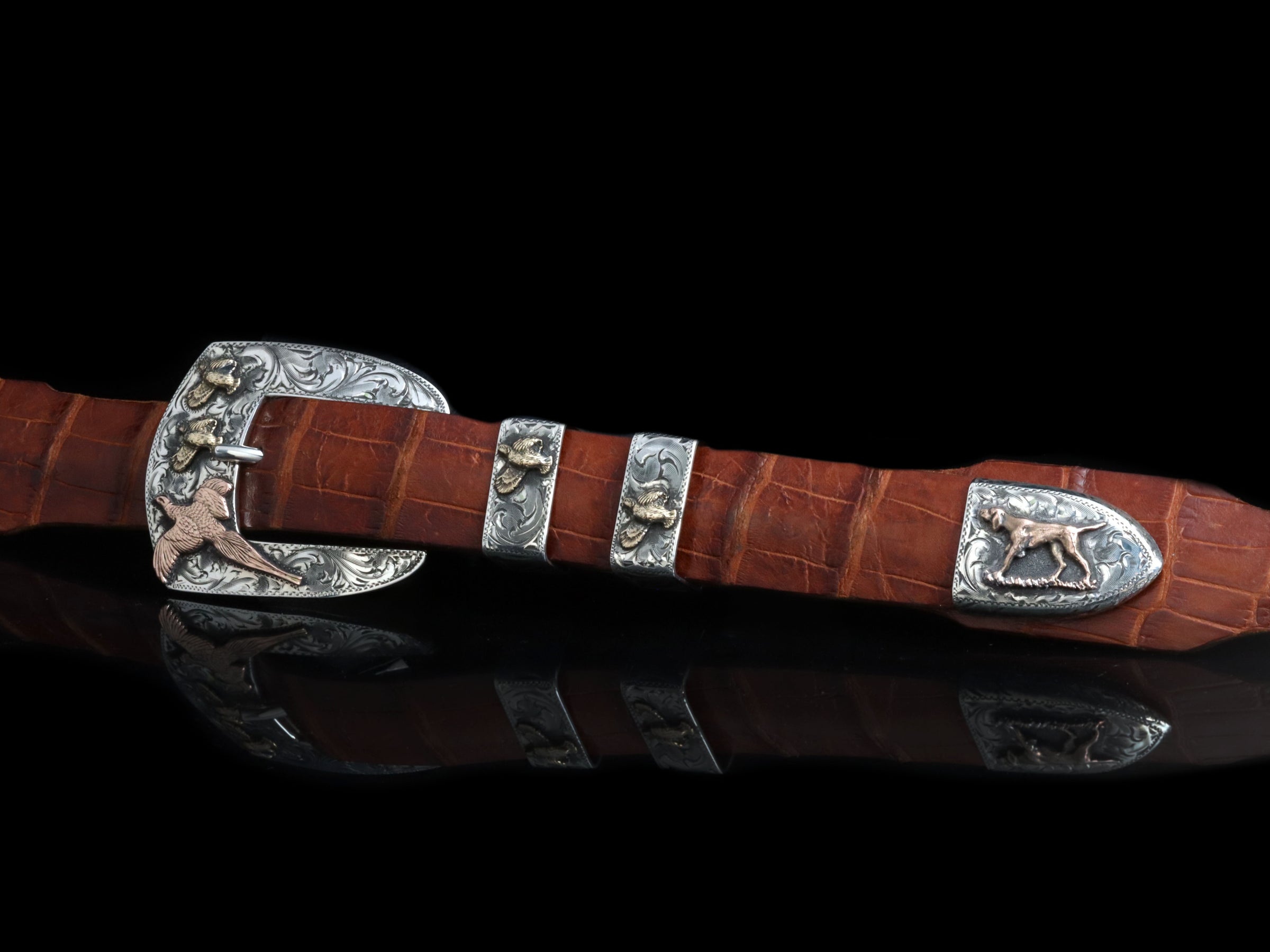 Designed by a friend, the Logan Bird Dog, Quail & Pheasant by Comstock Heritage is a 1", 4 piece, Sterling silver hand crafted buckle set with plenty of details.  Hand engraved throughout, it then features a 4 hand cast 14k gold flying quail and 1 gold pheasant flying away from a matching bird dog on the tip.