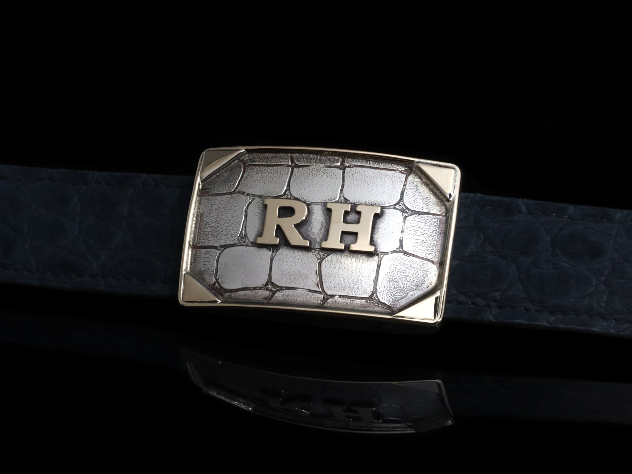 The Tyson Gator & Initials 14k by Comstock Heritage is a military style "Tyson" shape belt buckle featuring a 14k yellow gold wire edge. We then added two matching 14k gold hand cut initials of your choice in the center of our new "gator" style engraved background. This piece has our traditional "Tyson" top and bottom sides, making it hug your 1 ¼" belt perfectly.
