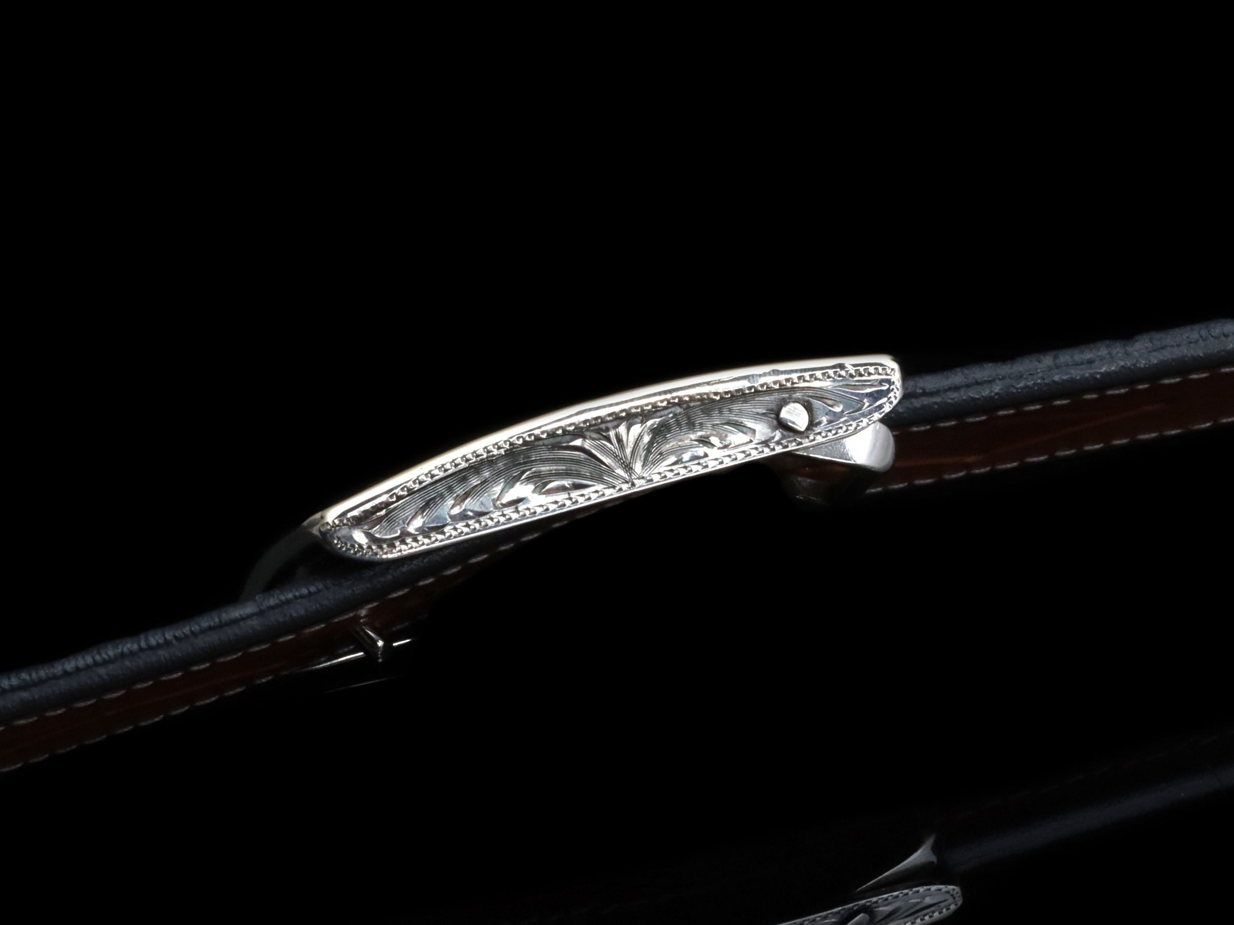 • What is the difference between a stationary bar and a hinge? Over time, the backs of our buckles have changed. Most vintage piece and our ranchwear pieces automatically come with a stationary bale/bar where the belt attaches to the buckle. It is a single piece of silver that is shaped in a wide U. If you wear a smaller belt than what the bar is made for, your belt could dip down on one side due to the extra space on the bar. A hinge moves and has a self leveling nub so that doesn't happen. You can order a buckle for a 1.5" belt and you can still wear your 1.25" belts also.