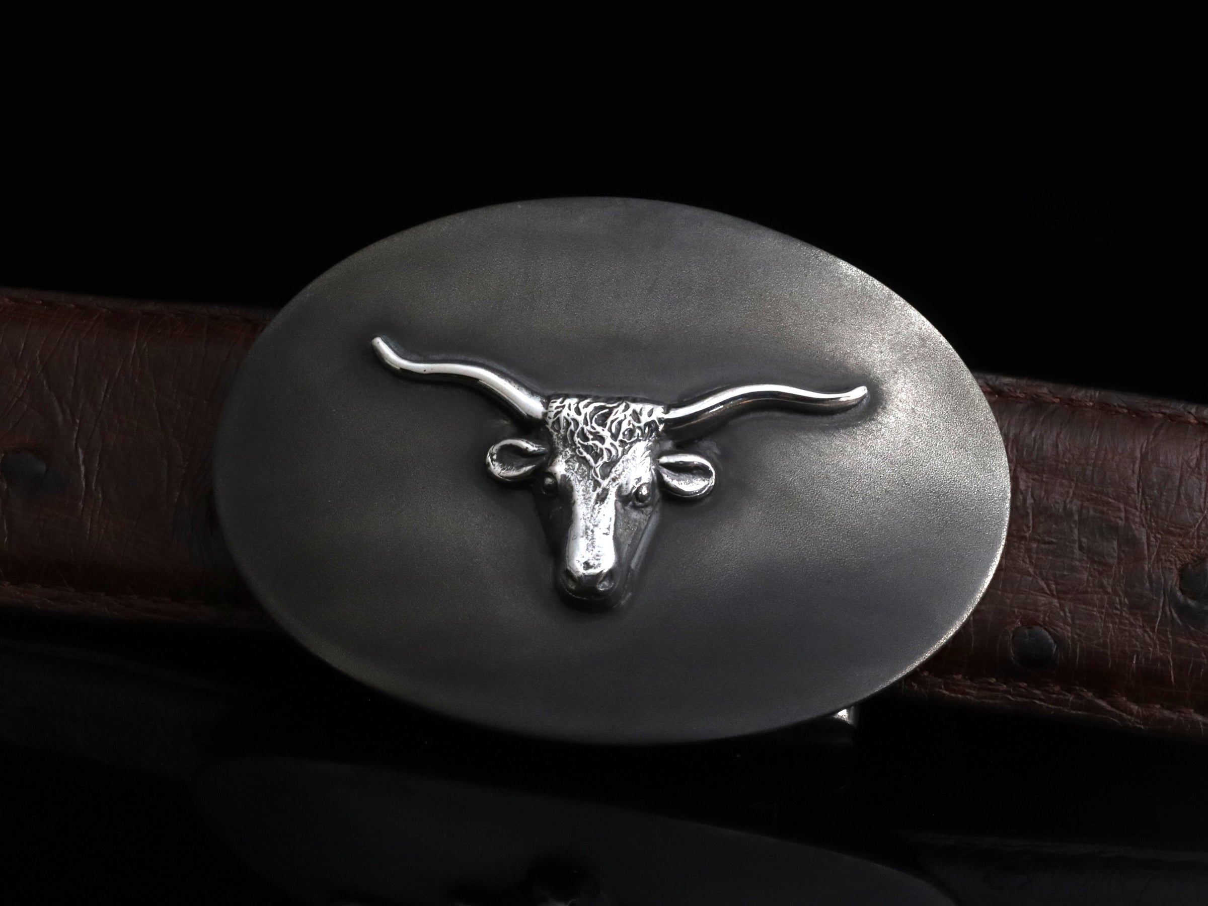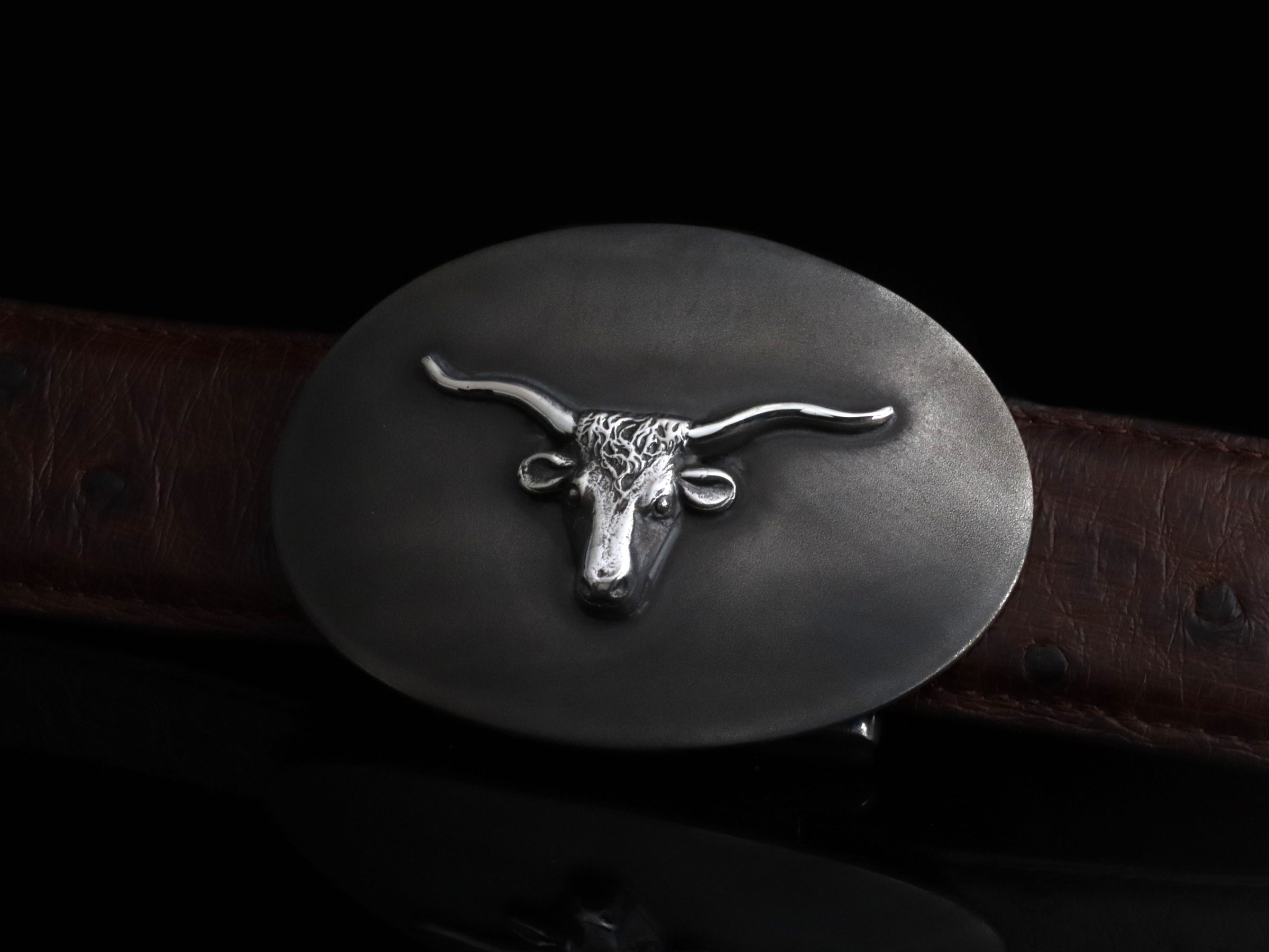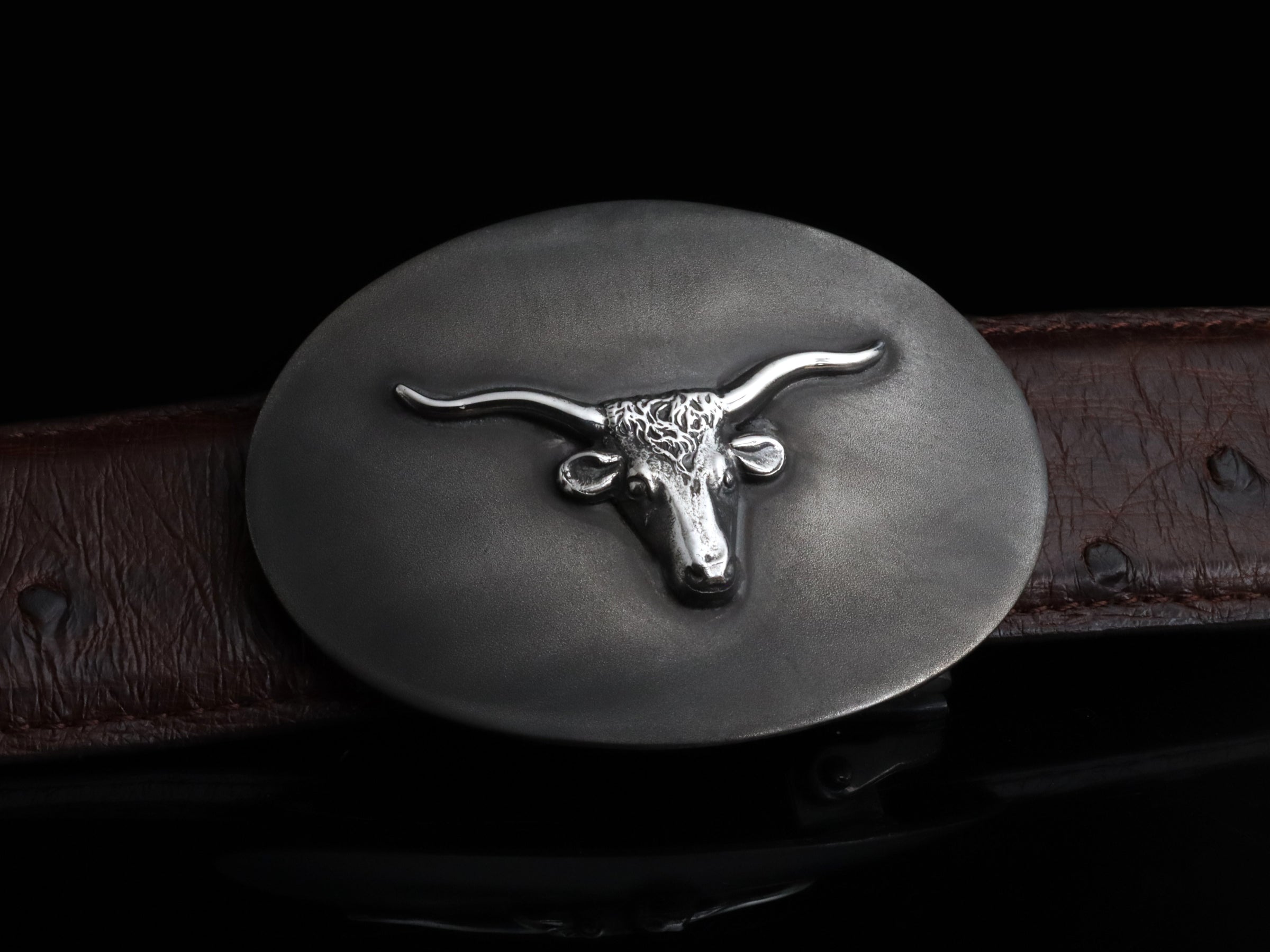 The AQ50 Longhorn Ranchwear by Comstock Heritage is a Sterling Silver "AQ50" shaped oval buckle featuring hand-stamped scenery around a hand cast Sterling Silver longhorn  figure. This piece has been given our tumbled "Ranchwear" finish.