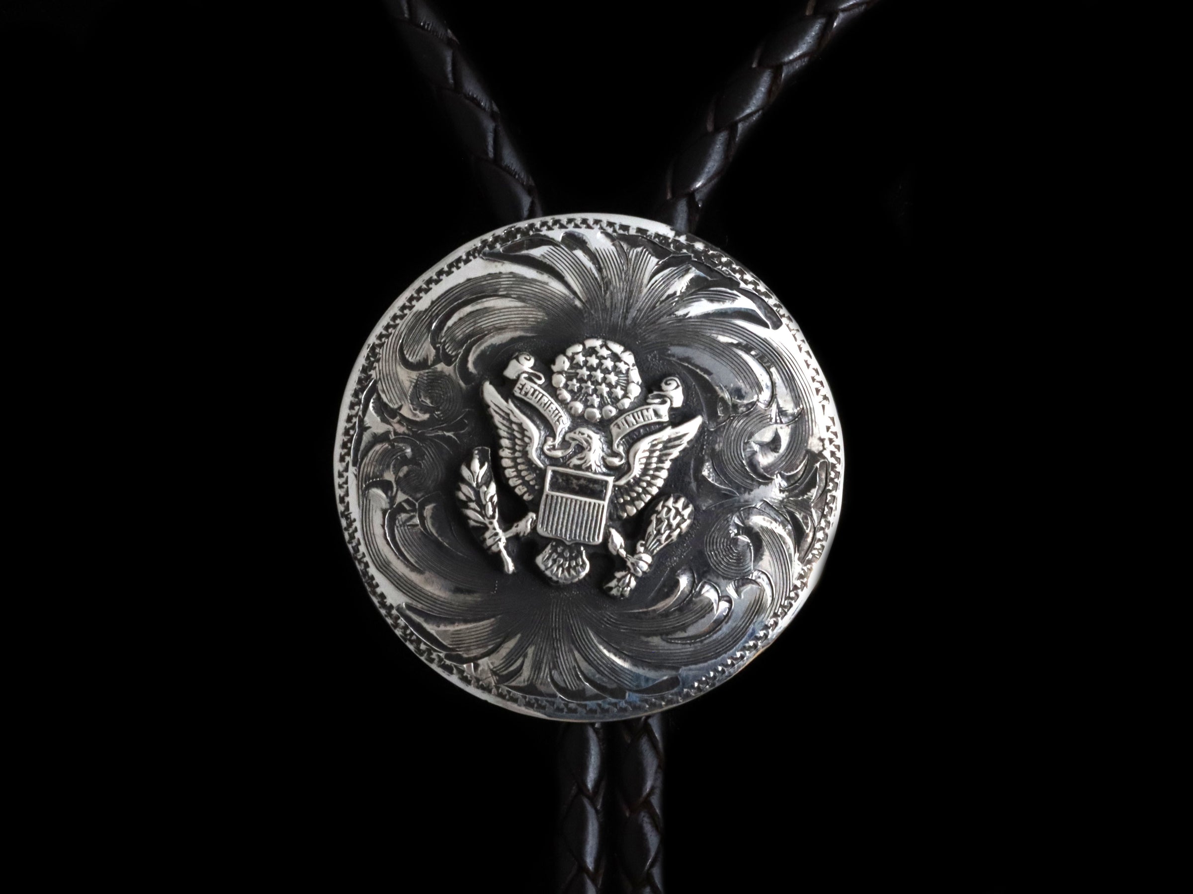 The USGA Seal Bolo Tie by Comstock Heritage is a distinguished piece crafted from solid sterling silver. This medium-sized bolo features a stamped sterling silver USGA Seal at its center, surrounded by intricate hand engraving that adds depth and detail.
