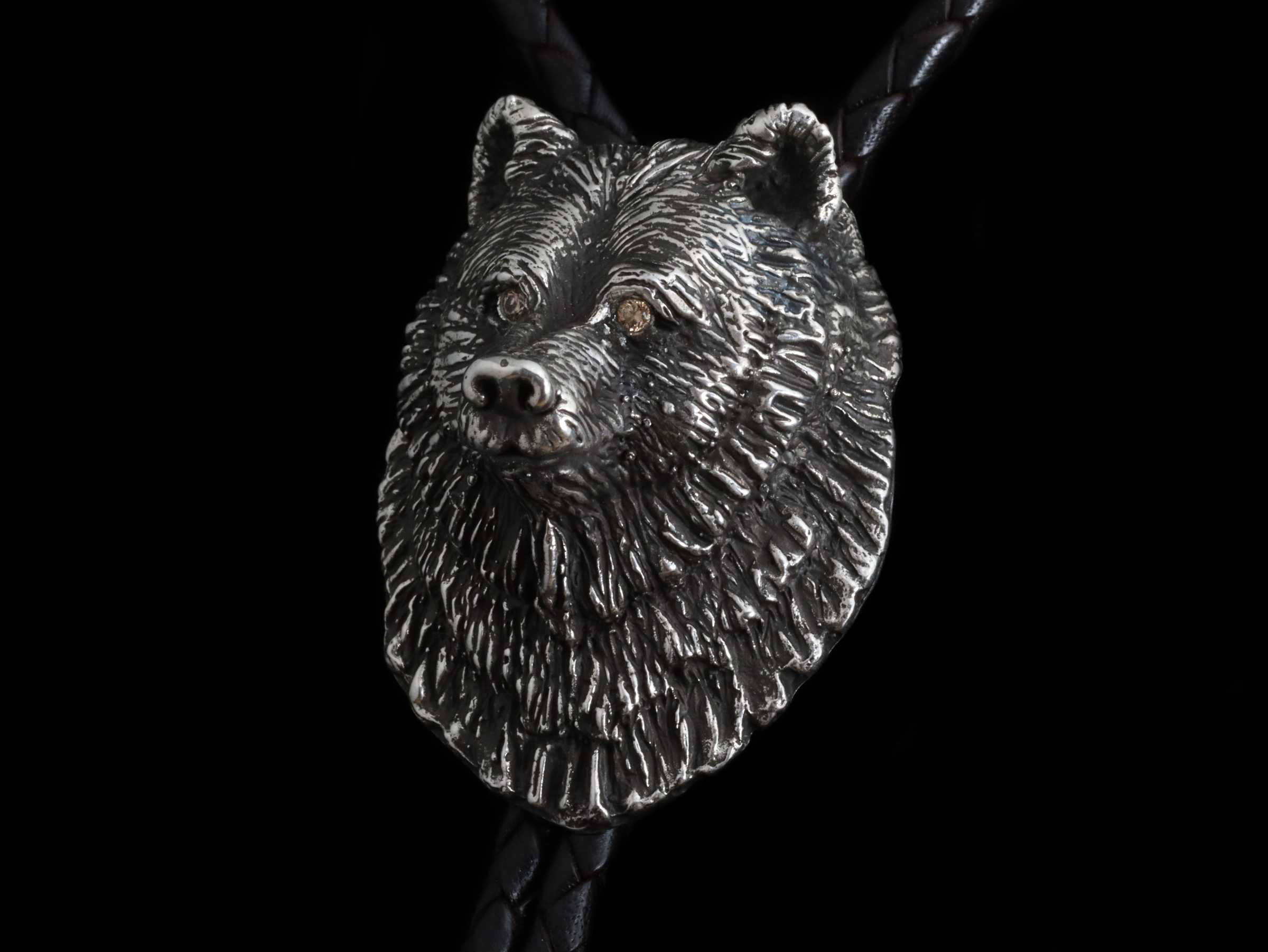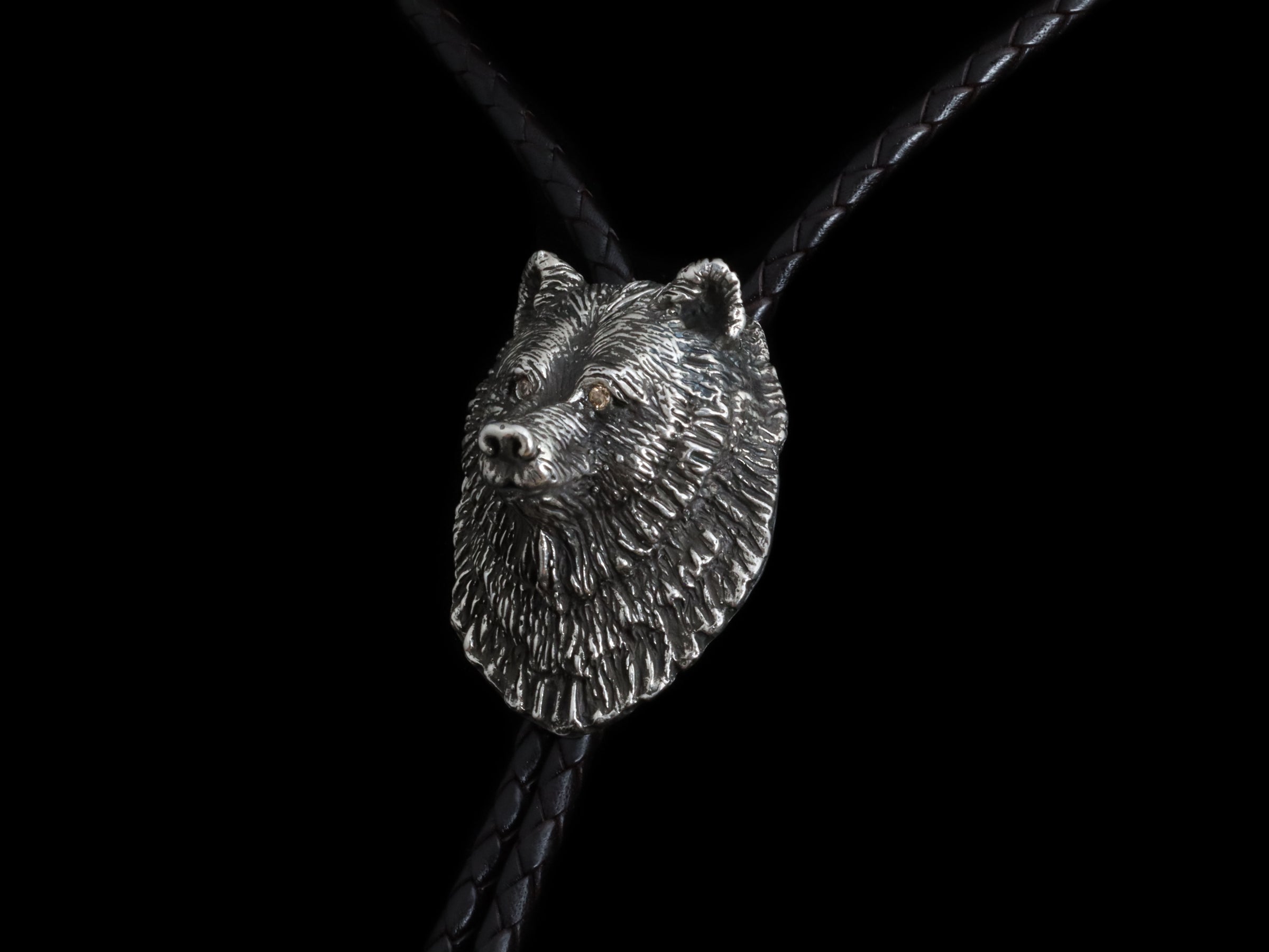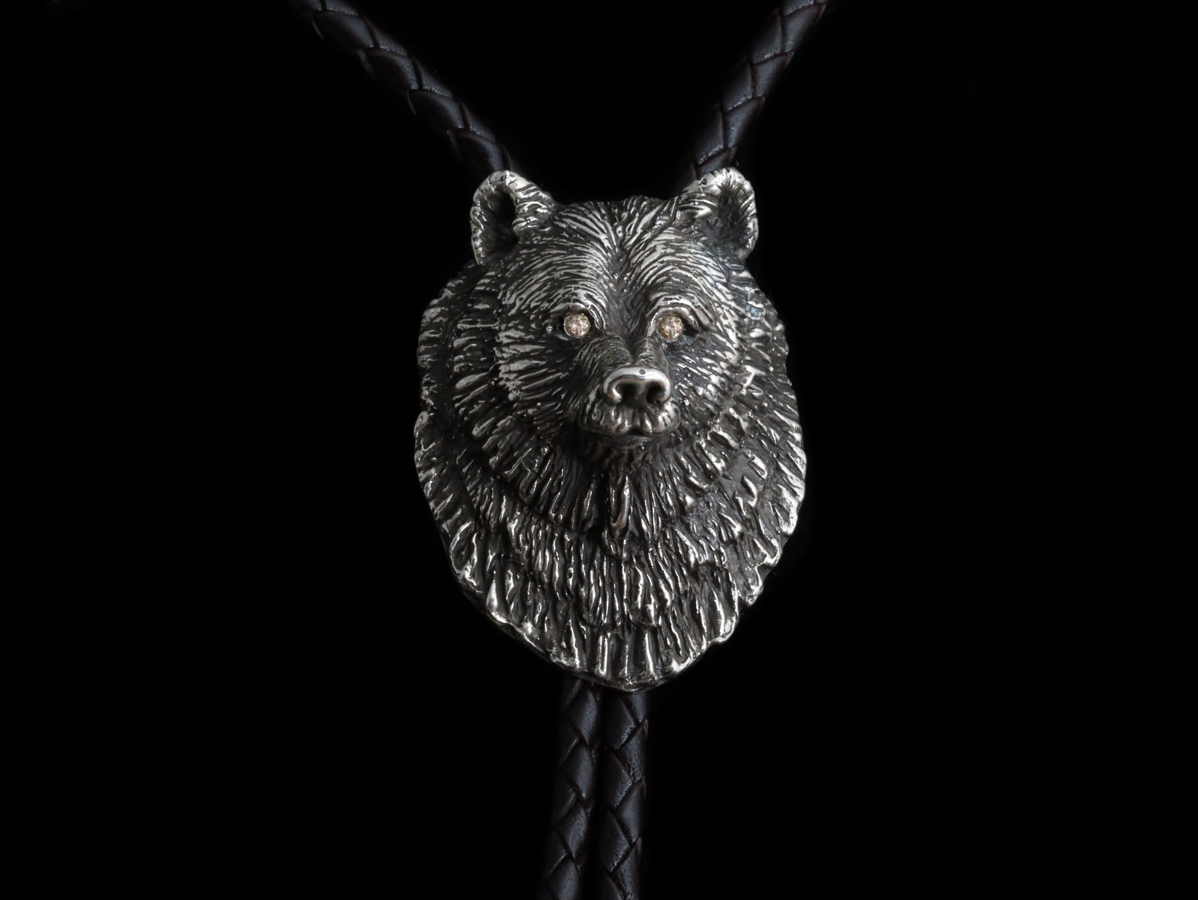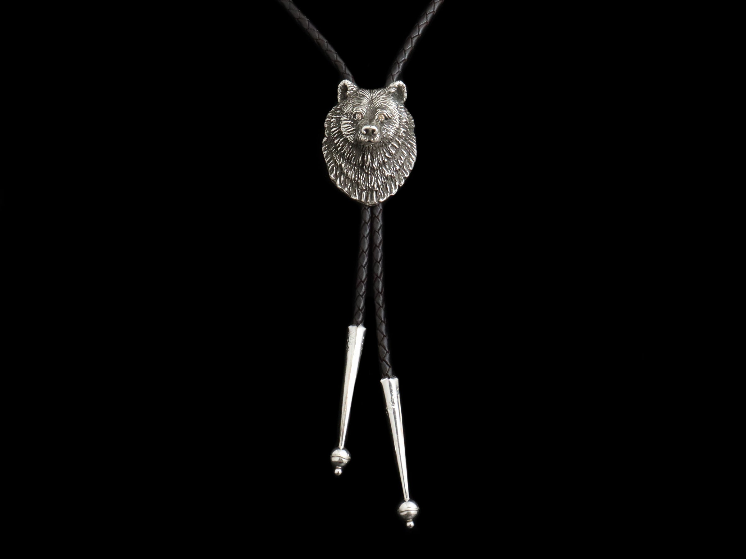 The Bear Bolo by Comstock Heritage is a finely crafted solid sterling silver piece featuring a detailed, heavy bear figure. In this version, we have added a pair of cognac diamonds to the eyes. Designed for both durability and style, it includes a full back and a secure bolo finding, making it easy to pair with cords or strings of your choice. A classic design that highlights expert craftsmanship, this bolo is a classic addition to any collection.