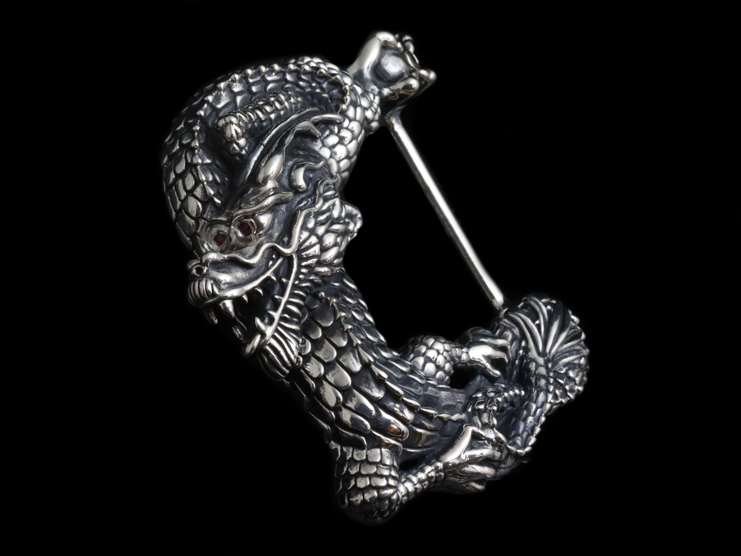The Dragon 2 Piece Set by Jeff Deegan Designs is a finely crafted Sterling silver buckle set that showcases intricate detailing. Every swirl and scale has been expertly etched, creating a rich texture and striking contrast. Added to this set is a pair of red ruby eyes and a yellow spessartite stone in his hand. This two-piece set captures the power and artistry of the dragon, making it a unique and eye-catching statement piece.