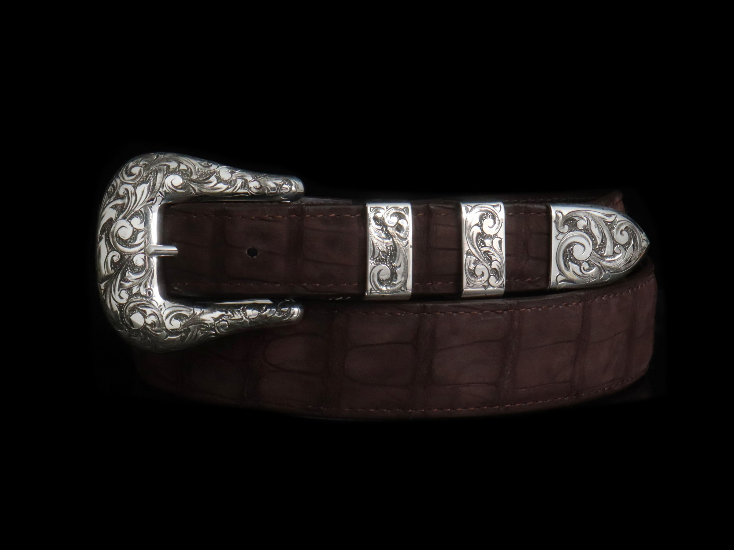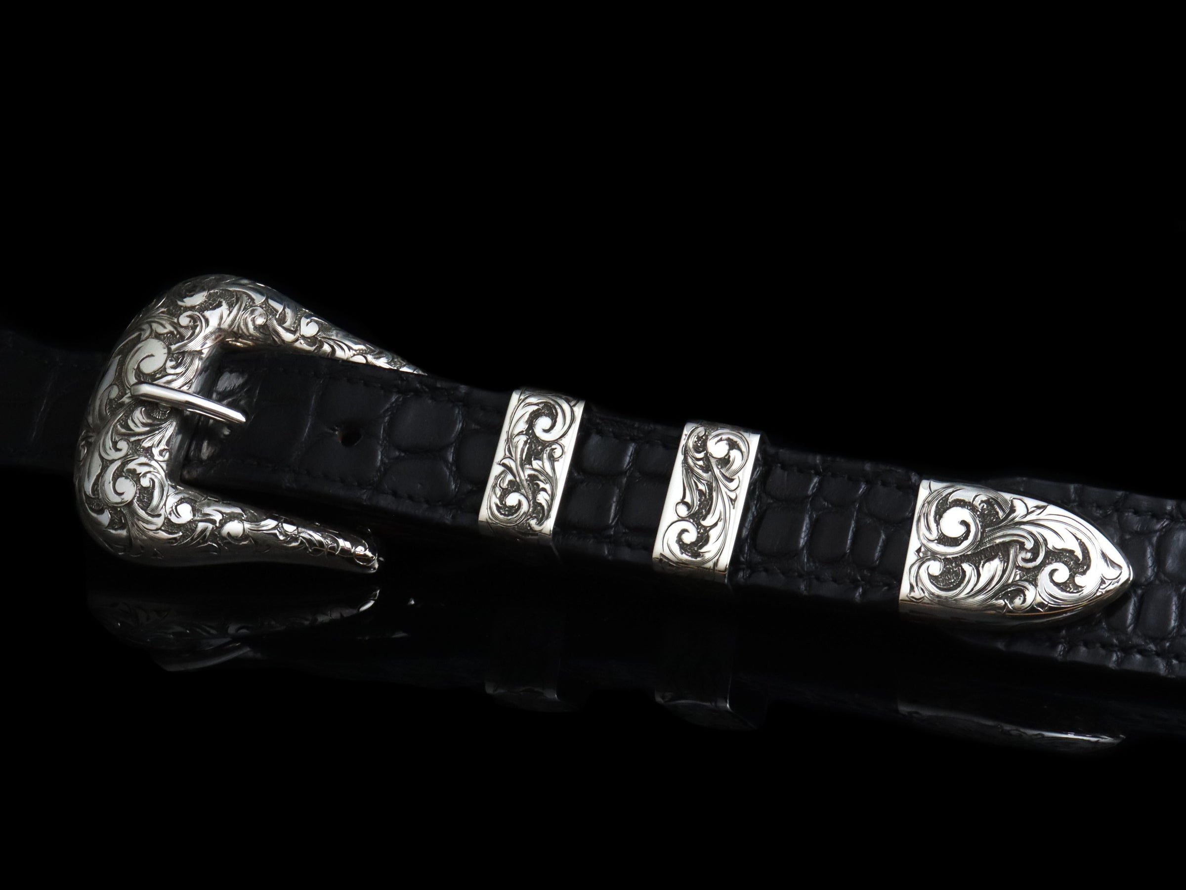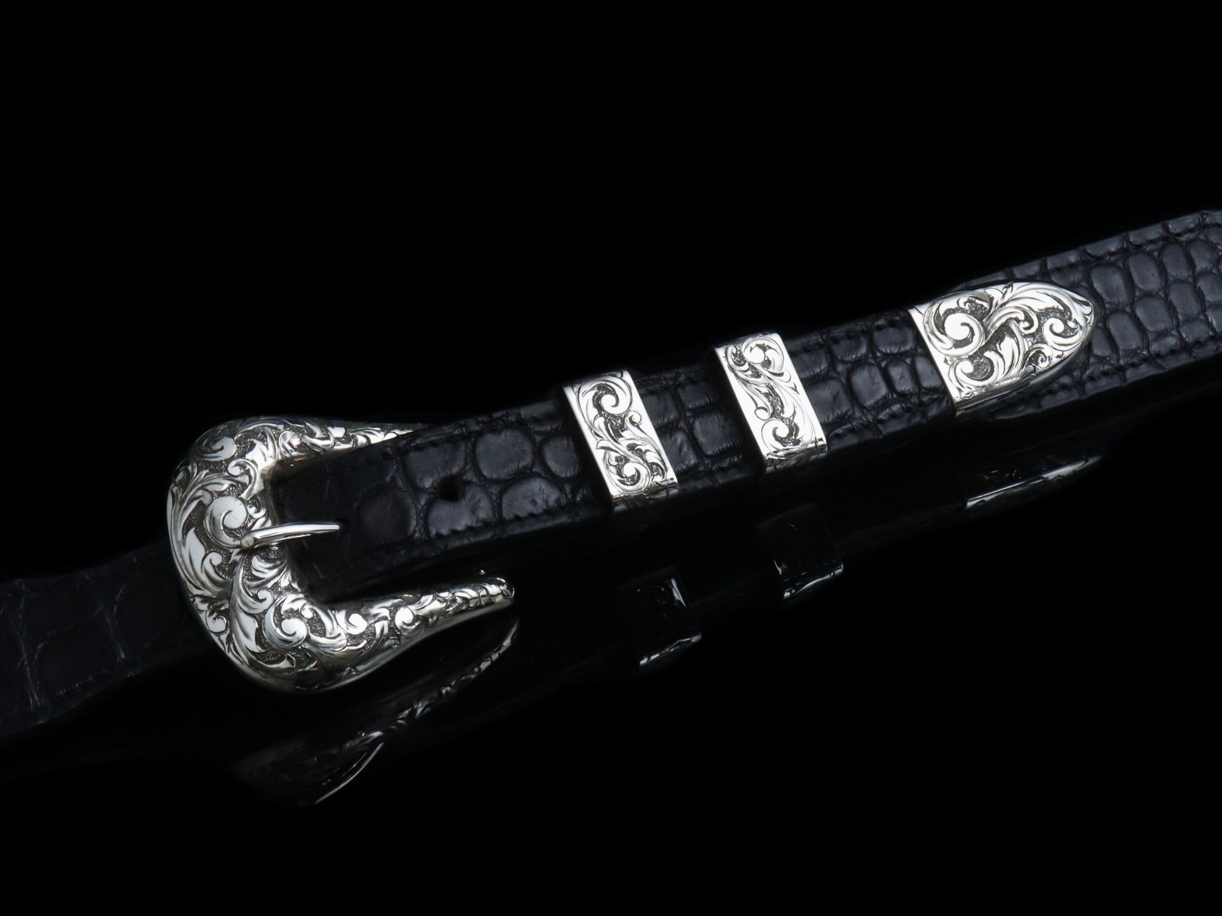The Winston Austin by Comstock Heritage is a 1" classic-shaped, Sterling silver four-piece buckle set with a modern Western look. The main buckle features our deep "Austin" style hand engraving, with coordinating patterns on the keeper and tip. An antiqued finish gives the set added contrast and vintage character.