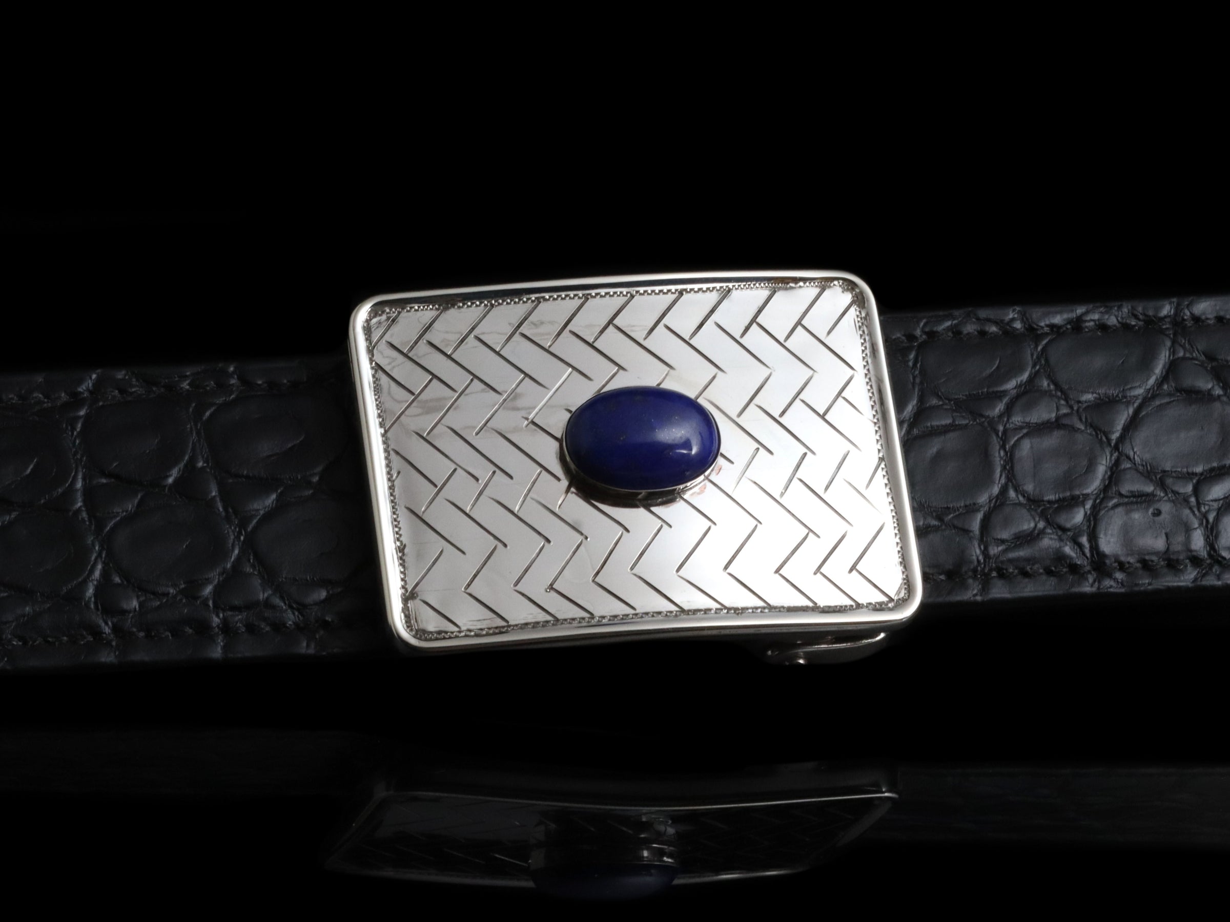 The Mason Large Herringbone & Lapis by Comstock Heritage is a rectangular Sterling silver Mesa-style trophy buckle that brings together classic elements with natural color. At the center sits a dark blue piece of Lapis, set against a larger herringbone style-engraved backdrop and framed by a hand-wrought Sterling silver wire. An antiqued finish enhances the contrast and completes the buckle with a rich, time-worn look.