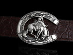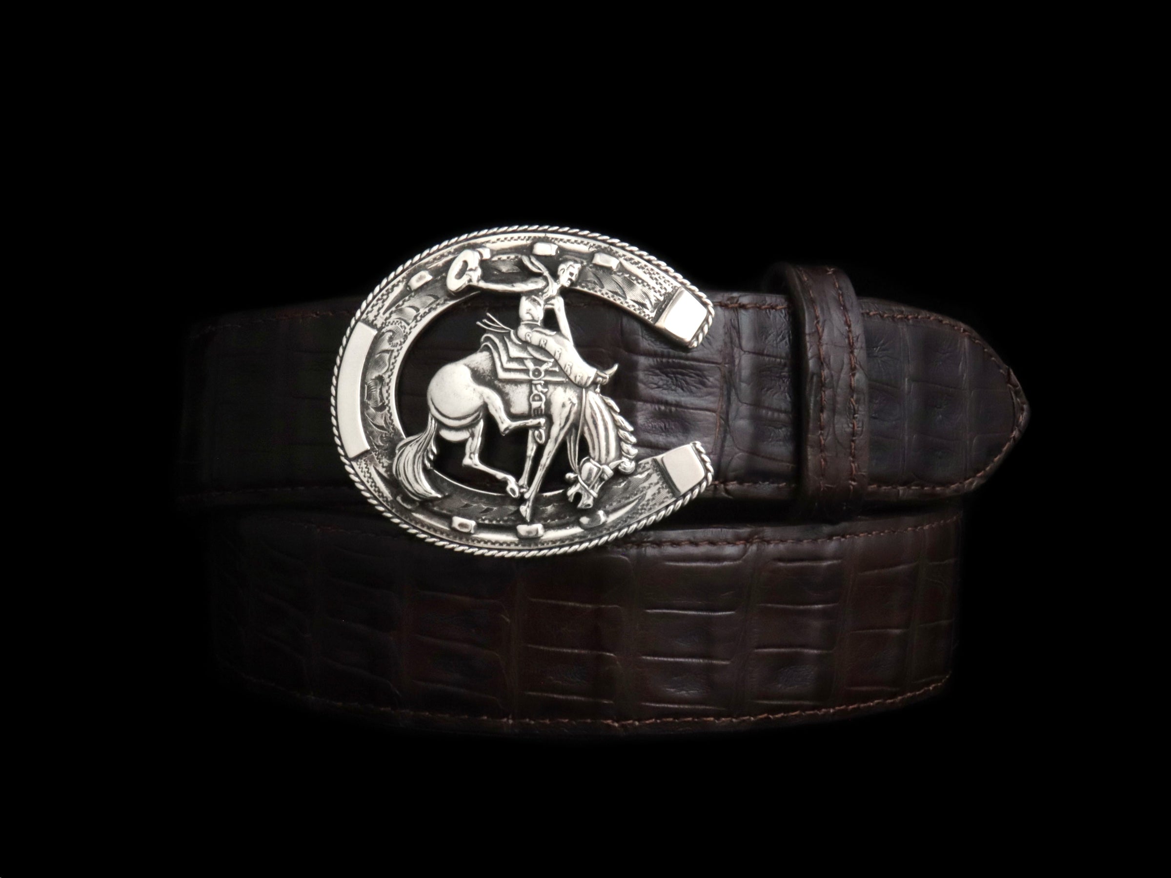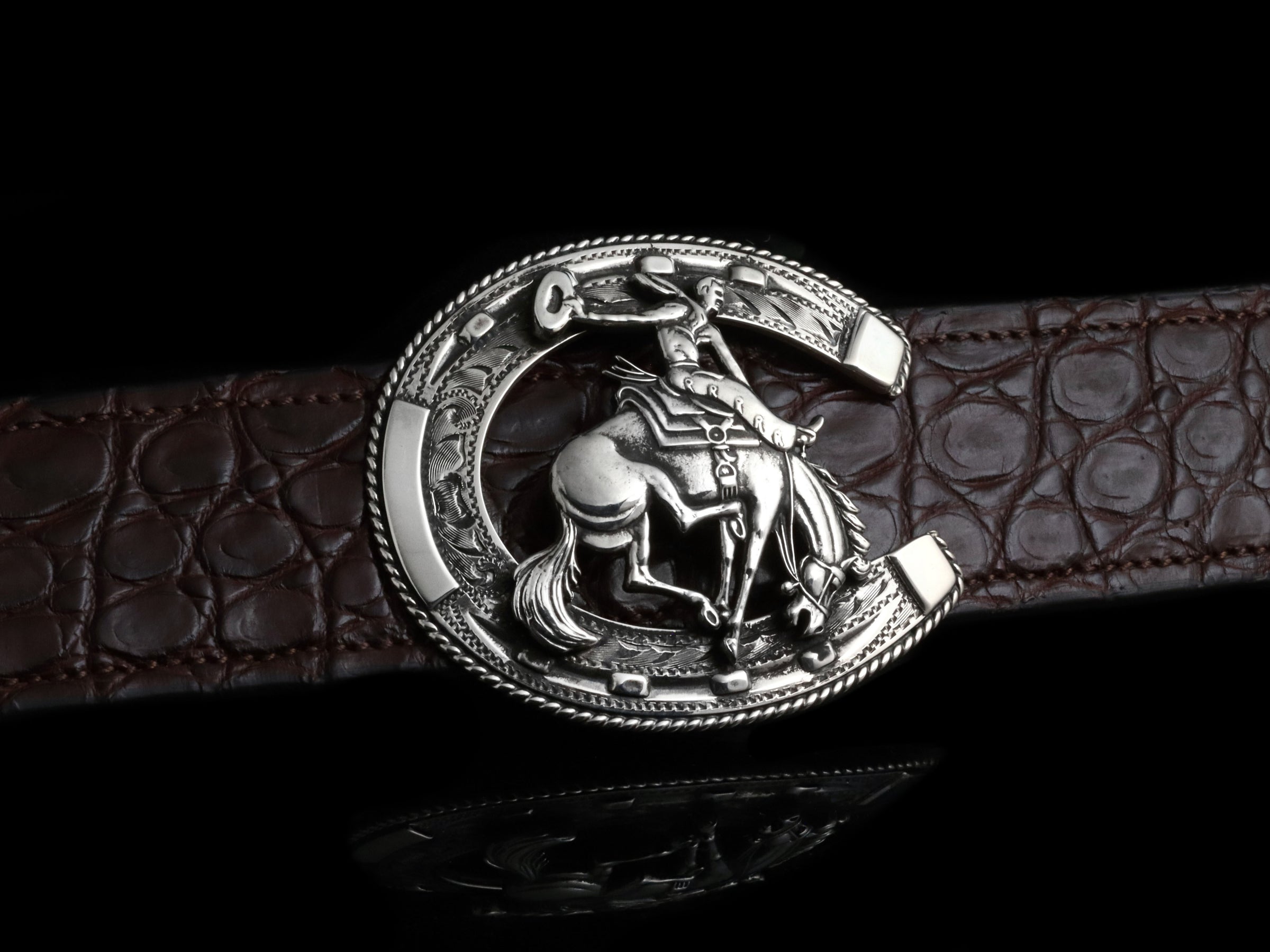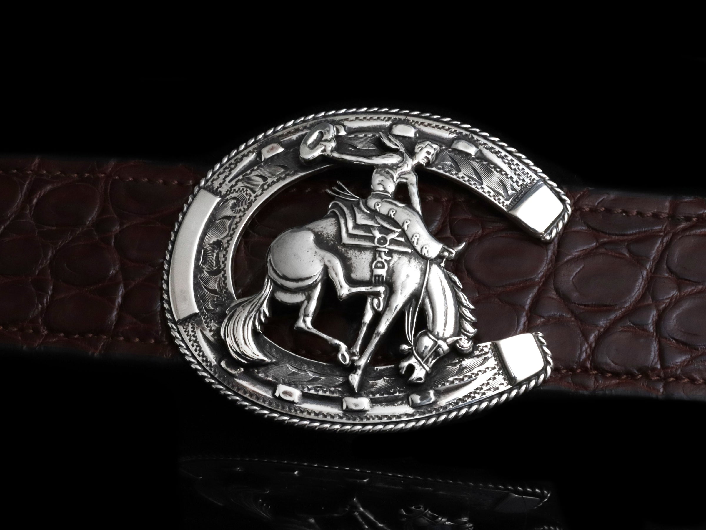 The AT50 Bronc by Comstock Heritage is a heavy gauge Sterling silver "AT50" horseshoe shaped buckle featuring a hand cast Sterling silver bronc and rider in the center surrounded by a hand twisted rope edge. This buckle is simple yet a statement piece all at the same time.