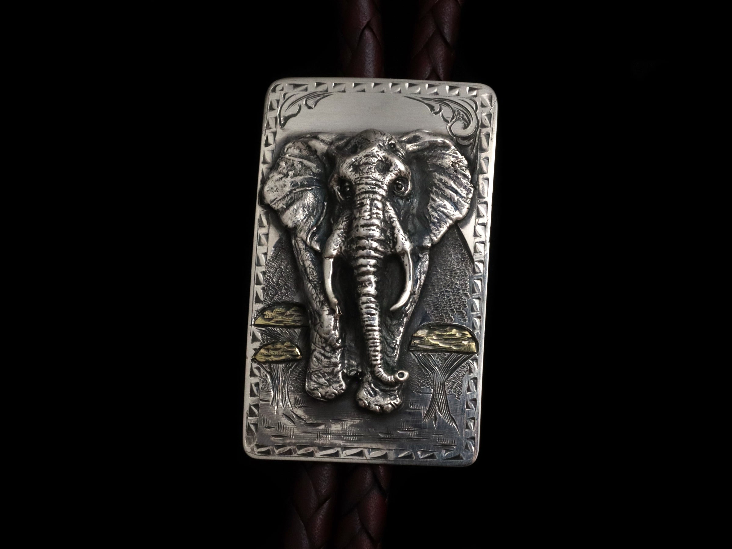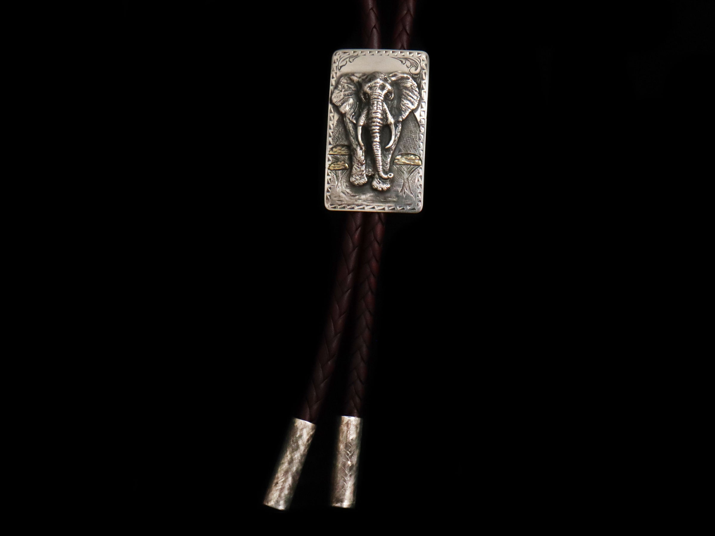 The Hatari Elephant Bolo 18k by Comstock Heritage is a true showpiece, handcrafted from solid Sterling silver and designed to make a statement. Spanning 4" tall, this striking bolo features a bold Sterling elephant coming at you from the 18k green gold tree tops.